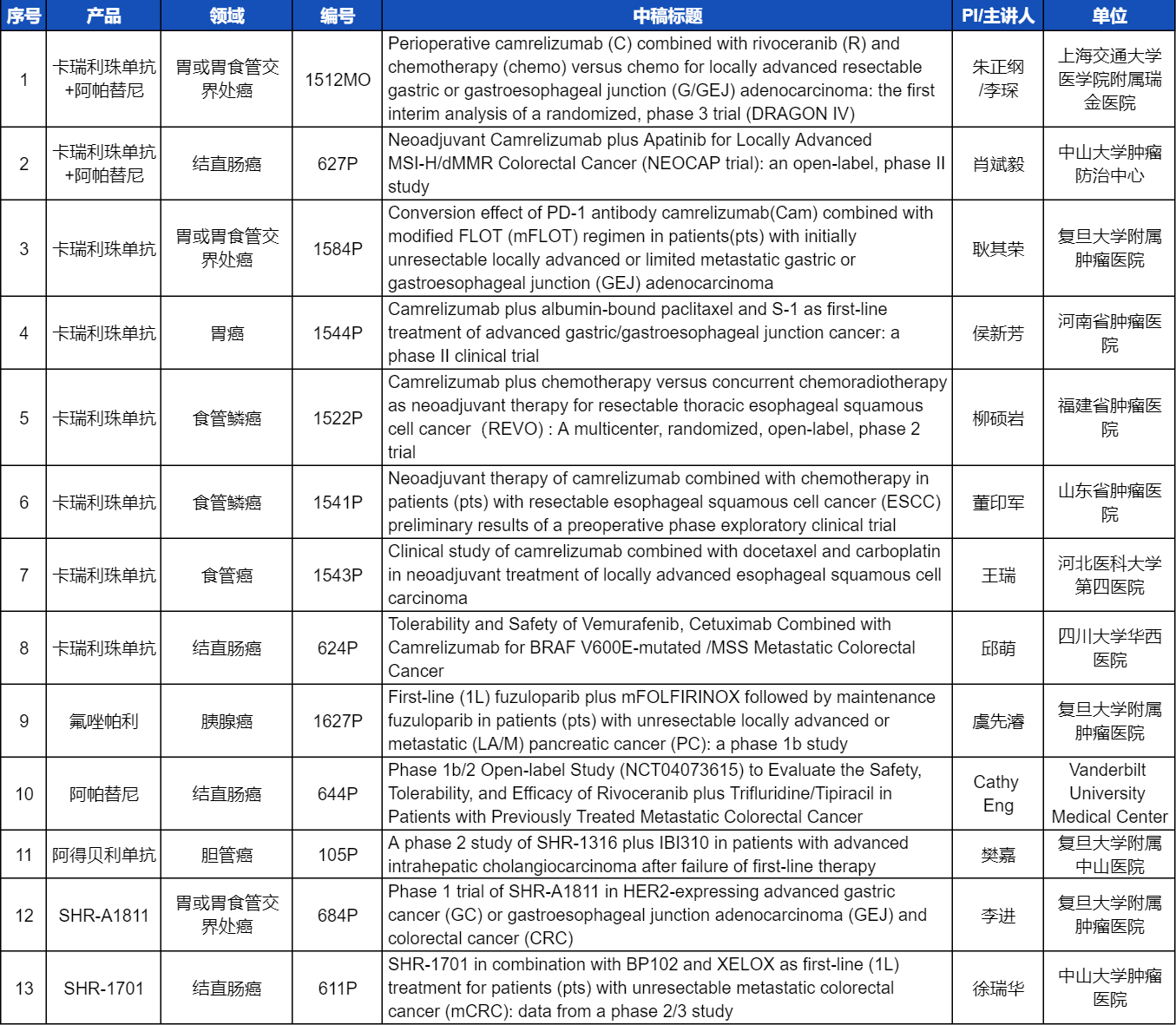 在消化系统肿瘤领域,永利娱乐城创新产品相关研究共入选1项口头报告和12项壁报展示。除了经典的明星药物卡瑞利珠单抗和阿帕替尼,SHR-A1811、SHR-1701等未上市创新产品也有相应研究入选。此外,阿得贝利单抗、氟唑帕利等已上市药物也在积极探索新的适应症,本次ESMO大会分别有肝内胆管癌和胰腺癌相关研究入选。这些新老药物前沿研究的不断出现,有望为消化系统肿瘤患者带来新的福音!