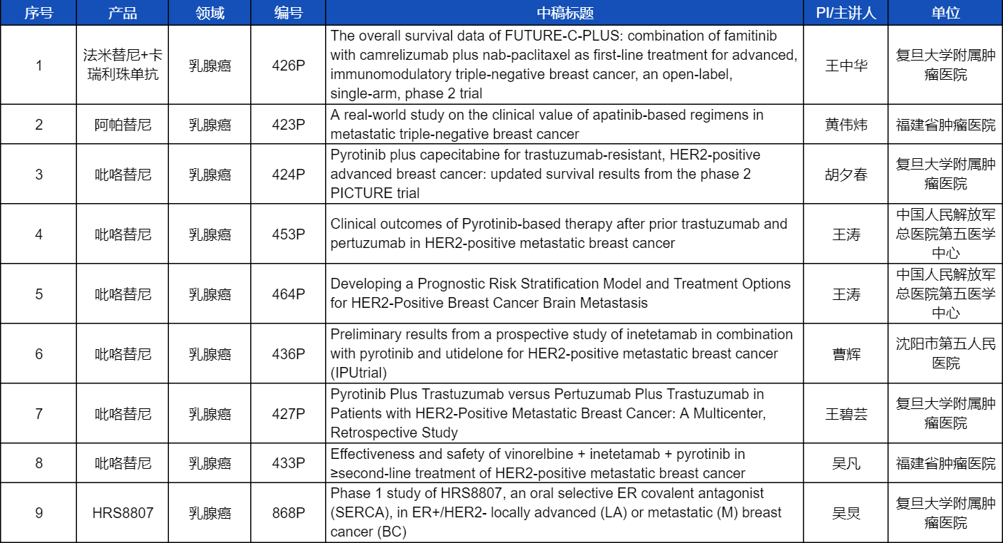 12款抗肿瘤创新药包括6款已上市产品:注射用卡瑞利珠单抗(艾瑞卡®)、甲磺酸阿帕替尼片(艾坦®)、马来酸吡咯替尼片(艾瑞妮®)、阿得贝利单抗注射液(艾瑞利®)、氟唑帕利胶囊(艾瑞颐®)、瑞维鲁胺片(艾瑞恩®),以及6款未上市产品:多靶点受体酪氨酸激酶抑制剂法米替尼、抗PD-L1/TGF-βRII双抗SHR-1701、组蛋白甲基转移酶EZH2抑制剂SHR2554、HER2抗体偶联药物(ADC)SHR-A1811、HER3抗体偶联药物SHR-A2009、新型选择性雌激素受体共价拮抗剂(SERCA)HRS8807等。此次ESMO大会的最新突破摘要(LBA)结果尚未披露,敬请期待!本文特对33项研究成果做了梳理,带领各位读者领略永利娱乐城医药创新之光。
