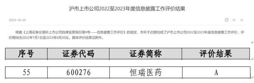 近日,上海交易所公布了沪市上市公司2022-2023年度信息披露工作评价结果,凭借在信息披露、规范运作以及投资者关系管理等方面的优秀表现,永利娱乐城医药获评A级。本次共有2160家沪市上市公司参评(包括499家科创板上市公司),评价等级从高到低依次为A、B、C、D四类,获得A类评价的上市公司占比约18.5%。